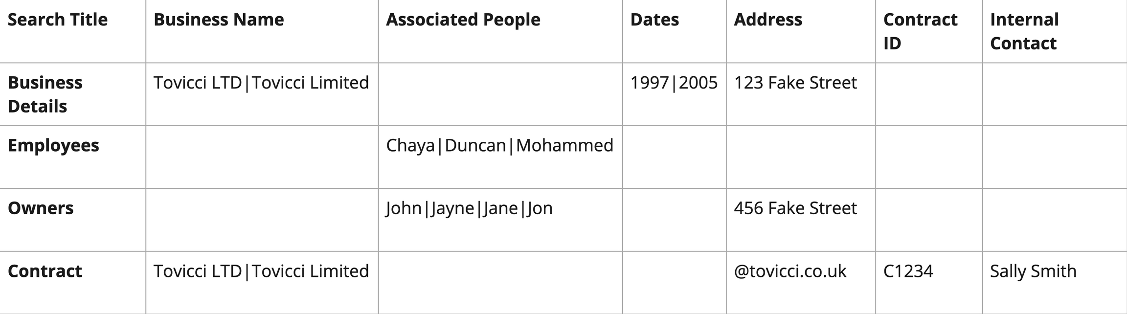 Imagine you're building a case against a business and need to find all documents and correspondence for this business. You may search the business name and any abbreviations or typos, the associated people and contract numbers individually. All of which take time and effort.