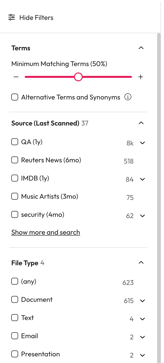 Select the number of terms that must be in a results content, filename, or metadata. If you're not sure what you are looking for or want to narrow down the number of results you have, this is a great help. Words like 'and' 'an' 'or' are not included in the term count.